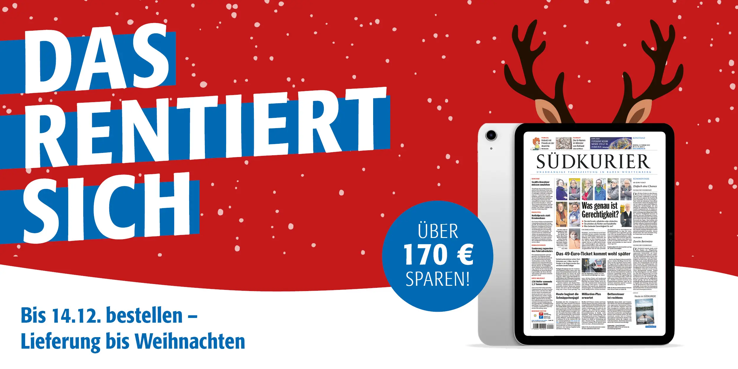 * SÜDKURIER digital inkl. Digitaler Zeitung und unbegrenztem Zugang zu allen Inhalten und Services auf SÜDKURIER Online ab 40,99 €/Monat Mindestlaufzeit 24 Monate. Das Angebot ist gültig bis zum 31.12.2025. Ein Angebot der SÜDKURIER GmbH, Medienhaus, Max-Stromeyer-Straße 178, 78467 Konstanz.